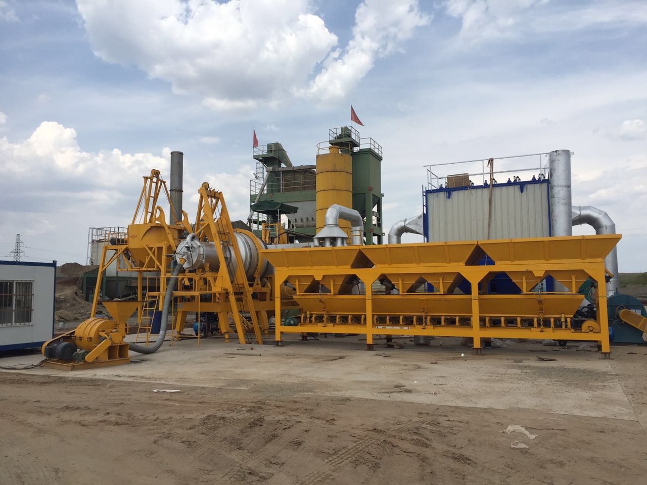 Завод представляет собой единый мобильный комплекс, включающий сушильный барабан, двухвальный принудительный смеситель и систему пылеочистки.